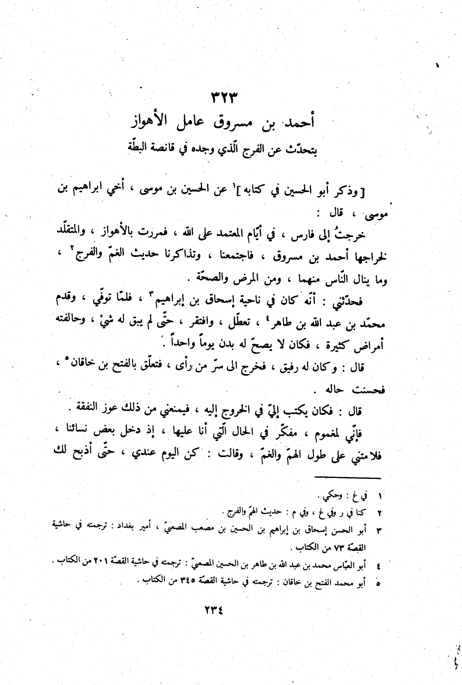 وَذكر أَبُو الْحُسَيْن فِي كِتَابه، عَن الْحُسَيْن بن مُوسَى، أخي إِبْرَاهِيم بن مُوسَى، قَالَ: خرجت إِلَى فَارس، فِي أَيَّام الْمُعْتَمد على الله، فمررت بالأهواز، والمتقلد لخراجها أَحْمد بن مَسْرُوق، فَاجْتَمَعْنَا وتذاكرنا حَدِيث الْغم والفرج، وَمَا ينَال النَّاس مِنْهُمَا، وَمن الْمَرَض وَالصِّحَّة.