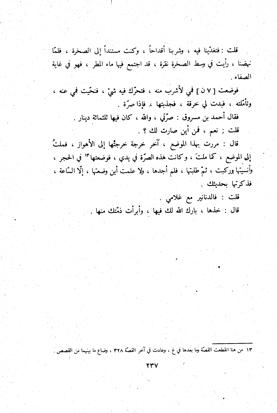 قلت: نعم، فَمن أَيْن صَارَت لَك؟ قَالَ: مَرَرْت بِهَذَا الْموضع، آخر خرجَة خرجتها إِلَى الأهواز، فملتُ إِلَى الْموضع، كَمَا ملتَ، وَكَانَت هَذِه الصرة فِي يَدي، فَوَضَعتهَا فِي الْحجر، وأنسيتها وَركبت، ثمَّ طلبتها، فَلم أَجدهَا، وَلَا علمت أَيْن وَضَعتهَا، إِلَّا السَّاعَة، فَذَكرتهَا بحديثك.