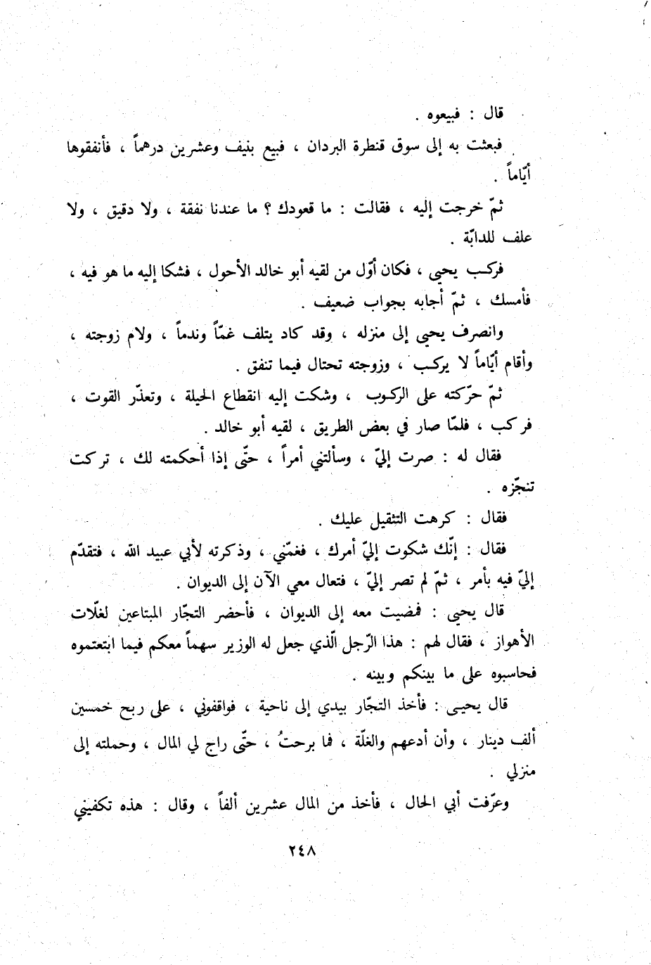 قَالَ يحيى: فمضيت مَعَه إِلَى الدِّيوَان، فأحضر التُّجَّار المبتاعين لغلات الأهواز، فَقَالَ لَهُم: هَذَا الرجل الَّذِي جعل لَهُ الْوَزير سَهْما مَعكُمْ فِيمَا ابتعتموه فحاسبوه على مَا بَيْنكُم وَبَينه.
