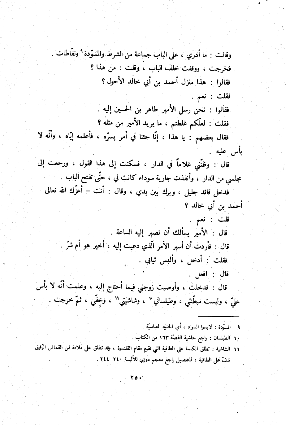 فَقلت: لَعَلَّكُمْ غلطتم، مَا يُرِيد الْأَمِير من مثله؟ فَقَالَ بَعضهم: يَا هَذَا، إِنَّا جِئْنَا فِي أَمر يسره، فَأعلمهُ إِيَّاه، وَأَنه لَا بَأْس عَلَيْهِ.