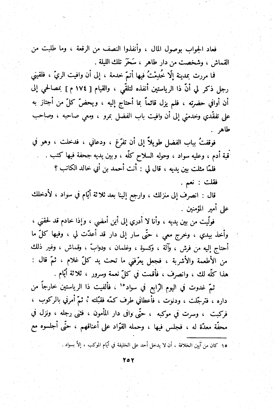 ثمَّ غَدَوْت فِي الْيَوْم الرَّابِع فِي سَواد، فألفيت ذَا الرياستين خَارِجا من دَاره، فترجلت ودنوت، فَأَعْطَانِي طرف كمه فقبلته، ثمَّ أَمرنِي بالركوب، فركبت، وسرت فِي موكبه، حَتَّى وافى دَار الْمَأْمُون، فَثنى رجله، وَنزل فِي محفة معدة لَهُ، فَجَلَسَ فِيهَا، وَحمله القواد على أَعْنَاقهم، حَتَّى أجلسوه مَعَ
