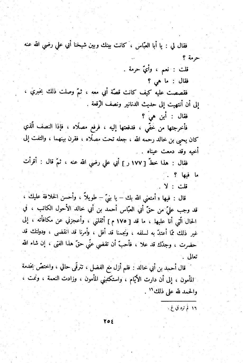 قَالَ: فِيهَا: أمتعني الله بك، يَا بني، طَويلا، وَأحسن الْخلَافَة عَلَيْك، قد وَجب عَليّ من حق أبي الْعَبَّاس أَحْمد بن أبي خَالِد الْأَحول الْكَاتِب، فِي الْحَال الَّتِي أَنا عَلَيْهَا، مَا قد أثقلني، وأعجزني عَن مكافأته، إِلَى غير ذَلِك مِمَّا أَعْتَد بِهِ لسلفه، ونجمنا قد أفل، وأمرنا قد انْقَضى، ودولتك قد حضرت، وَجدك قد علا، فَأحب أَن تقضي عني حق هَذَا الْفَتى، إِن شَاءَ الله، تَعَالَى.
