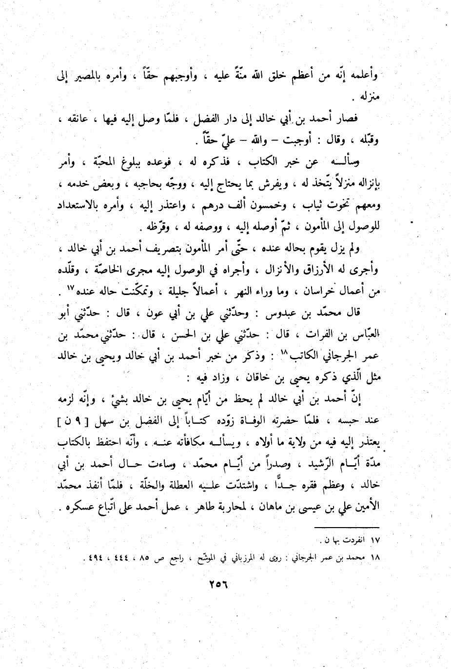 قَالَ مُحَمَّد بن عَبدُوس: وحَدثني عَليّ بن أبي عون، قَالَ: حَدثنِي أَبُو الْعَبَّاس بن الْفُرَات، قَالَ: حَدثنِي عَليّ بن الْحسن، قَالَ: حَدثنِي مُحَمَّد بن عمر الْجِرْجَانِيّ الْكَاتِب: وَذكر من خبر أَحْمد بن أبي خَالِد وَيحيى بن خَالِد مثل الَّذِي ذكره يحيى بن خاقَان، وَزَاد فِيهِ: إِن أَحْمد بن أبي خَالِد لم يحظ من أَيَّام يحيى بن خَالِد بِشَيْء، وَإنَّهُ لزمَه عِنْد حَبسه، فَلَمَّا حَضرته الْوَفَاة زوده كتابا إِلَى الْفضل بن سهل يعْتَذر إِلَيْهِ فِيهِ من ولَايَة مَا أولاه، ويسأله مكافأته عَنهُ، وَأَنه احتفظ بِالْكتاب مُدَّة أَيَّام الرشيد، وصدرا من أَيَّام مُحَمَّد، وَسَاءَتْ حَال أَحْمد بن أبي خَالِد، وَعظم فقره جدا، واشتدت عَلَيْهِ العطلة والخلة، فَلَمَّا أنفذ مُحَمَّد الْأمين عَليّ بن عِيسَى بن ماهان لمحاربة طَاهِر؛ عمل أَحْمد على اتِّبَاع عسكره.