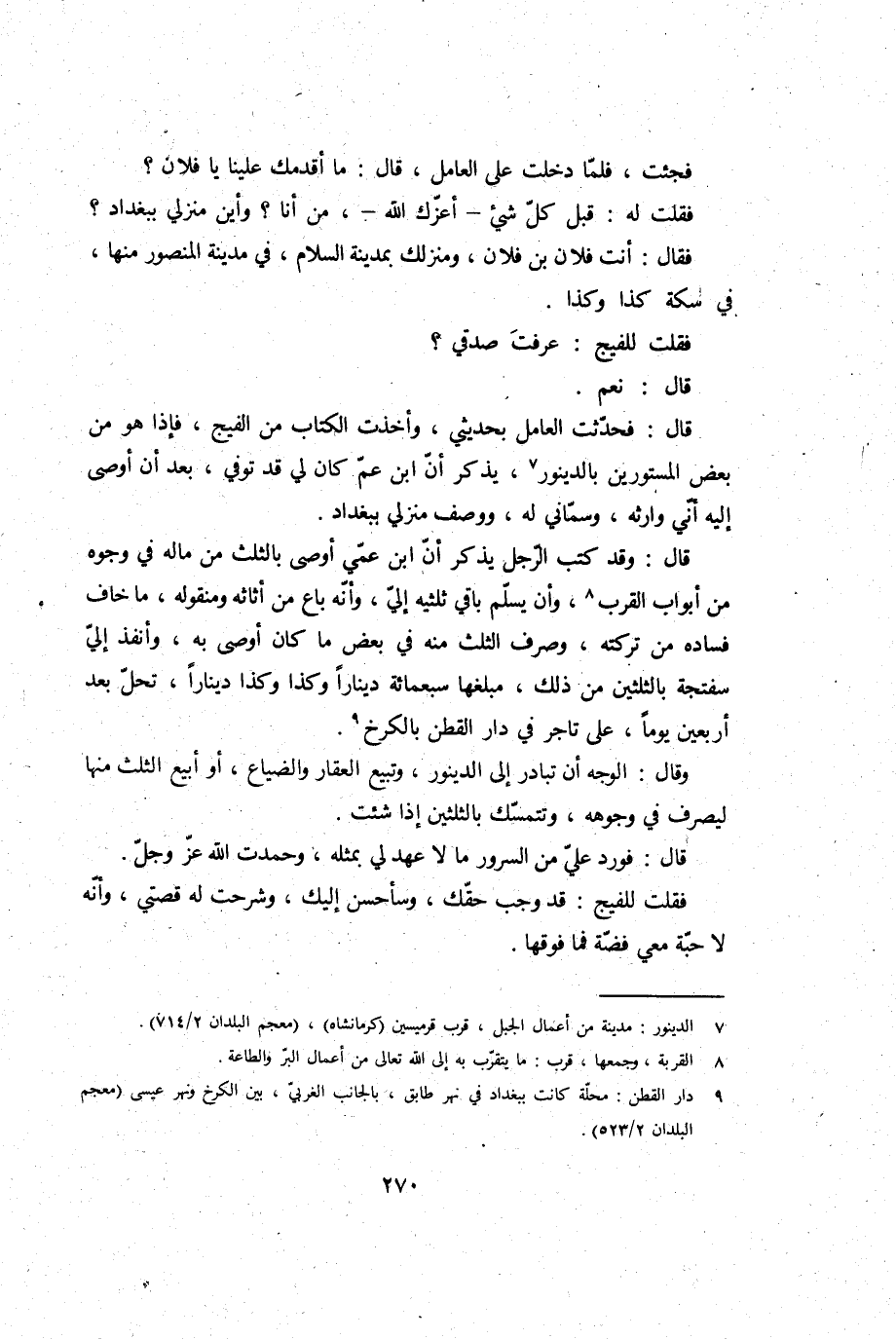 قَالَ: فَحدثت الْعَامِل بحديثي، وَأخذت الْكتاب من الفيج، فَإِذا هُوَ من بعض المستورين بالدينور، يذكر أَن ابْن عَم كَانَ لي قد توفّي، بعد أَن أوصى إِلَيْهِ أَنِّي وَارثه، وسماني لَهُ، وَوصف منزلي بِبَغْدَاد.