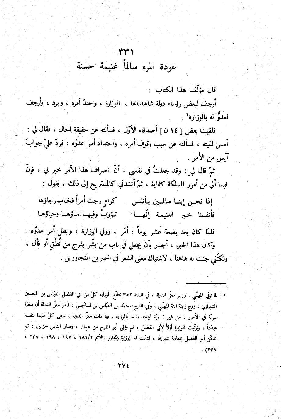 ثمَّ قَالَ لي: وَقد جعلت فِي نَفسِي، أَن انصراف هَذَا الْأَمر خير لي، فَإِن فِيمَا أَلِي من أُمُور المملكة كِفَايَة، ثمَّ أَنْشدني كالمستريح إِلَى ذَلِك، يَقُول: