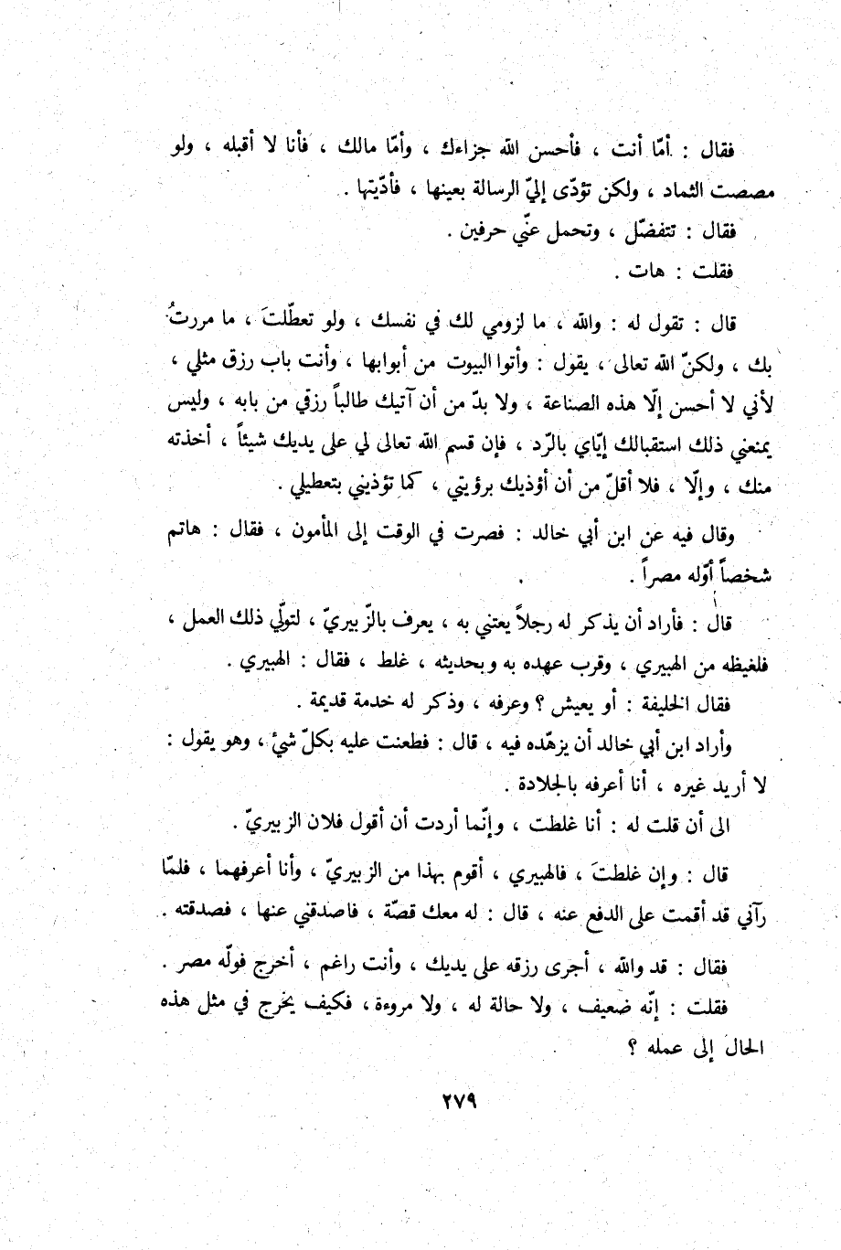 قَالَ: تَقول لَهُ، وَالله، مَا لزومي لَك فِي نَفسك، وَلَو تعطلت، مَا مَرَرْت بك، وَلَكِن الله، تَعَالَى، يَقُول: {وَأْتُوا الْبُيُوتَ مِنْ أَبْوَابِهَا} [الْبَقَرَة: 189] ، وَأَنت بَاب رزق مثلي؛ لِأَنِّي لَا أحسن إِلَّا هَذِه الصِّنَاعَة، وَلَا بُد من أَن آتِيك طَالبا رِزْقِي من بَابه، وَلَيْسَ يَمْنعنِي ذَلِك استقبالك إيَّايَ بِالرَّدِّ، فَإِن قسم الله، تَعَالَى، لي على يَديك شَيْئا؛ أَخَذته مِنْك، وَإِلَّا فَلَا أقل من أَن أؤذيك برؤيتي، كَمَا تؤذيني بتعطيلي.