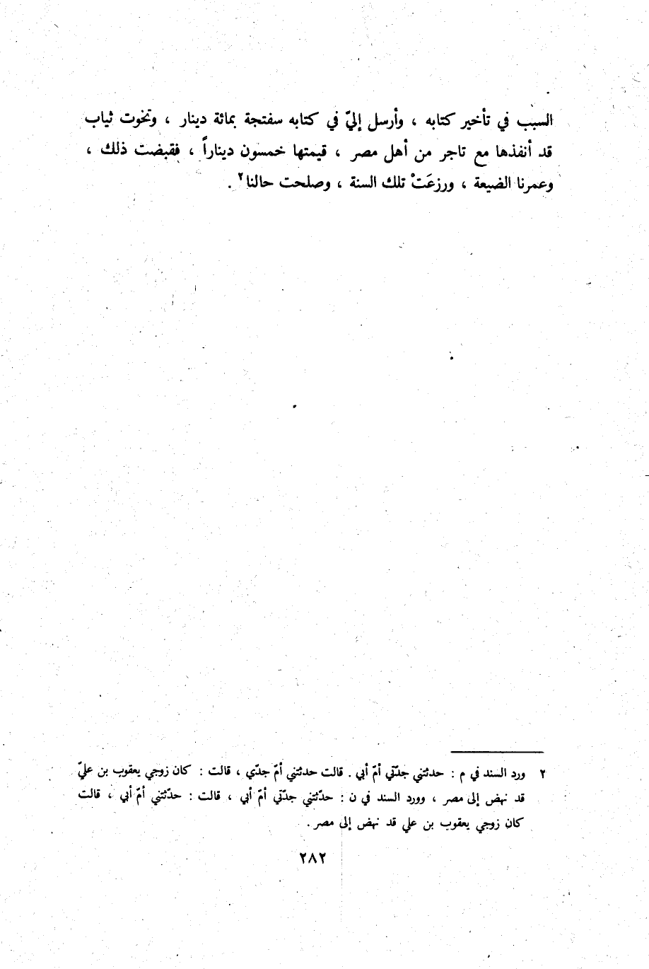 السَّبَب فِي تَأْخِير كِتَابه، وَأرْسل إِلَيّ فِي كِتَابه سفتجة بِمِائَة دِينَار، وتخوت ثِيَاب، قد أنفذها مَعَ تَاجر من أهل مصر، قيمتهَا خَمْسُونَ دِينَارا، فقبضت ذَلِك، وعمرنا الضَّيْعَة، ورزعت تِلْكَ السّنة، وصلحت حَالنَا.