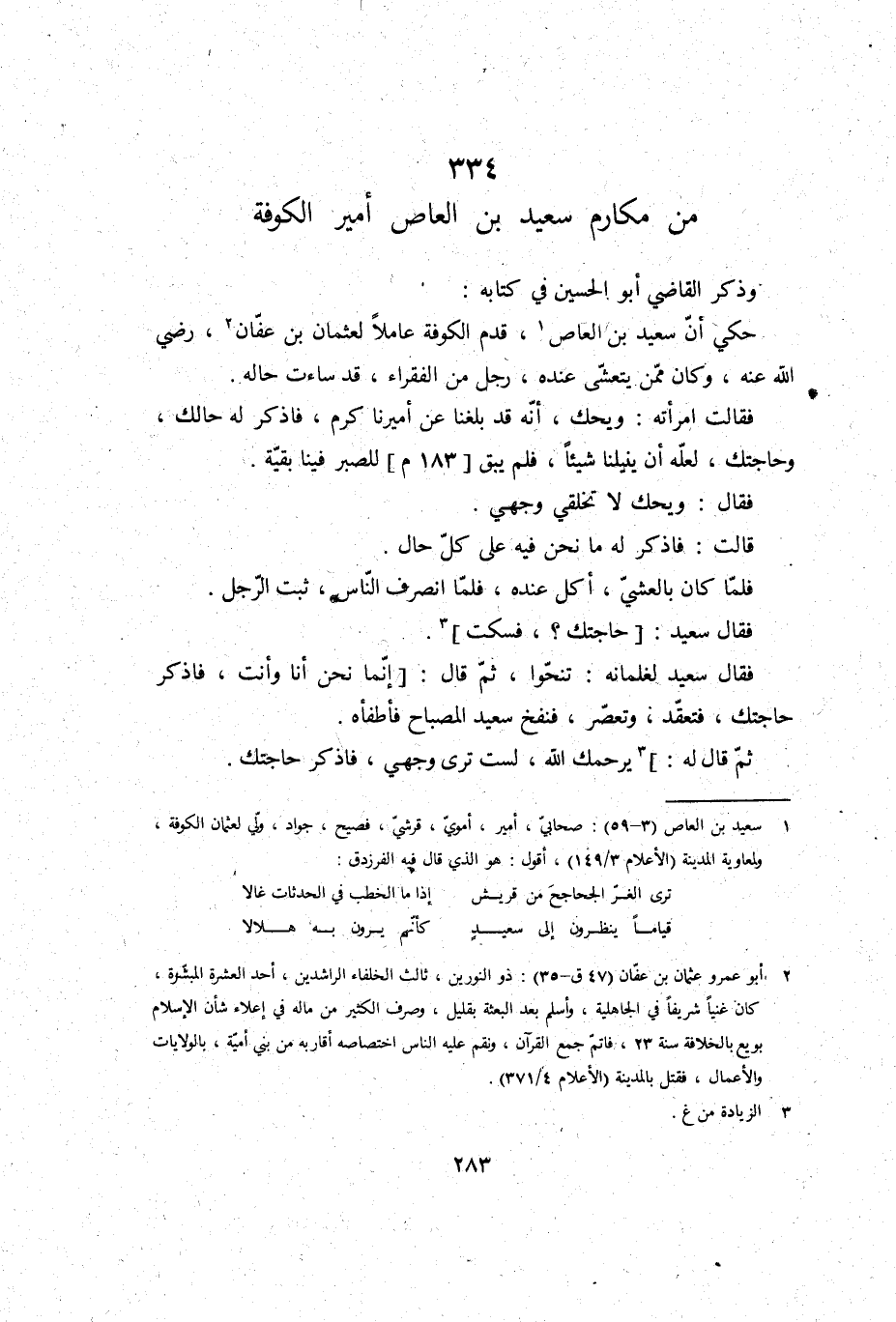 وَذكر القَاضِي أَبُو الْحُسَيْن فِي كِتَابه: حُكيَ أَن سعيد بن الْعَاصِ، قدم الْكُوفَة عَاملا لعُثْمَان بن عَفَّان، رَضِي الله عَنهُ، وَكَانَ مِمَّن يتعشى عِنْده، رجل من الْفُقَرَاء، قد ساءت حَاله.