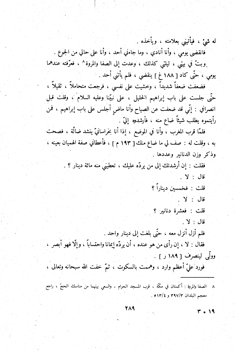 فَلَمَّا قَرُبَ الْمَغْرِبُ، وَأَنَا فِي الْمَوْضِعِ؛ إِذَا أَنَا بِخُرَاسَانِيٍّ يَنْشُدُ ضَالَّةً، فَصِحْتُ بِهِ، وَقُلْتُ لَهُ: صِفْ لِي مَا ضَاعَ مِنْكَ، فَأَعْطَانِي صِفَةَ الْهِمْيَانِ بِعَيْنِهِ، وَذَكَرَ وَزْنَ الدَّنَانِيرِ وَعَدَدَهَا.