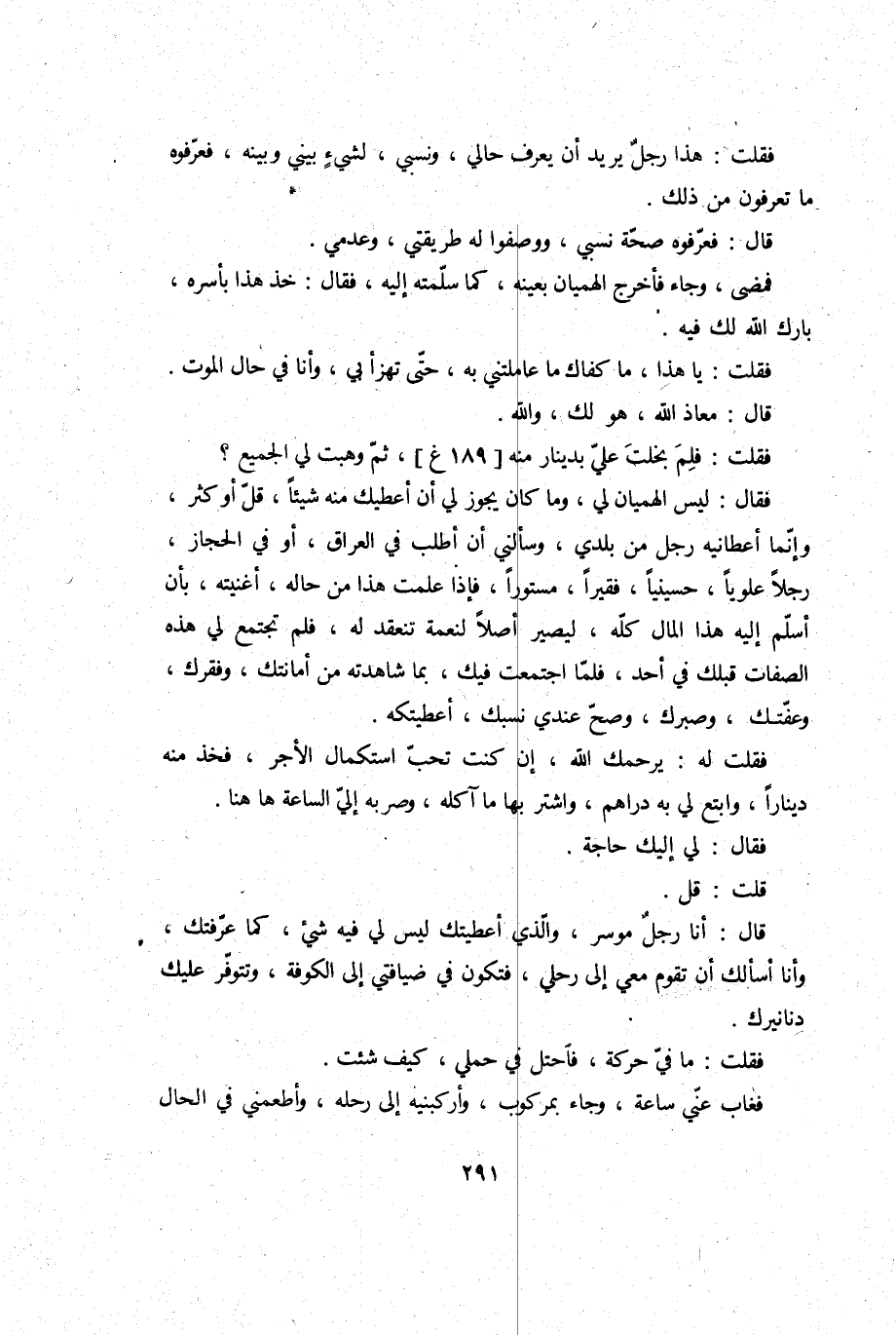 قَالَ: أَنَا رَجُلٌ مُوسِرٌ، وَالَّذِي أَعْطَيْتُكَ لَيْسَ لِي فِيهِ شَيْءٌ، كَمَا عَرَّفْتُكَ، وَأَنَا أَسْأَلُكَ أَنْ تَقُومَ مَعِي إِلَى رَحْلِي، فَتَكُونَ فِي ضِيَافَتِي إِلَى الْكُوفَةِ، وَتَتَوَفَّرُ عَلَيْكَ دَنَانِيرُكَ.
