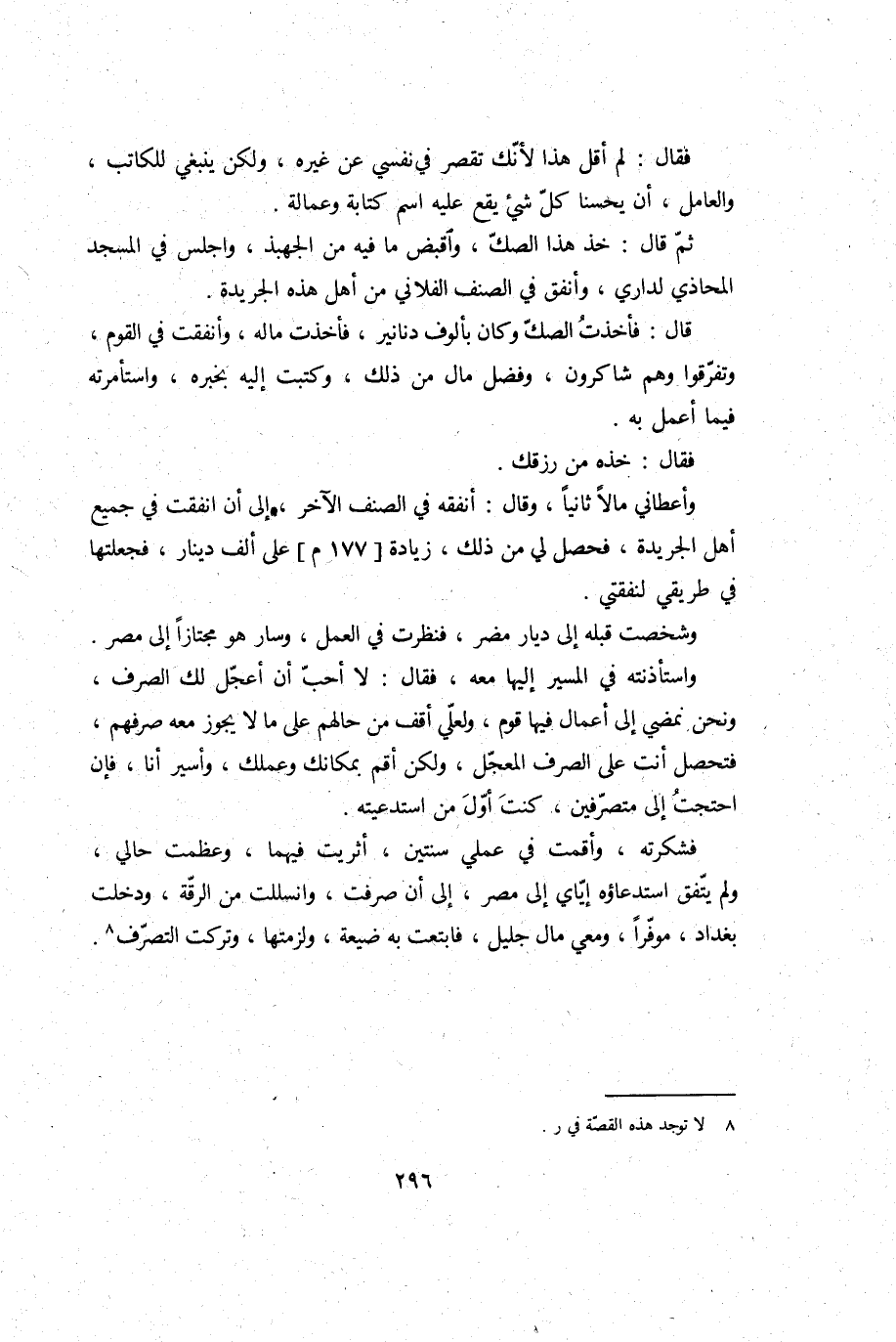 واستأذنته فِي الْمسير إِلَيْهَا مَعَه، فَقَالَ: لَا أحب أَن أعجل لَك الصّرْف، وَنحن نمضي إِلَى أَعمال فِيهَا قوم، ولعلي أَقف من حَالهم على مَا لَا يجوز مَعَه صرفهم، فَتحصل أَنْت على الصّرْف الْمُعَجل، وَلَكِن أقِم بمكانك وعملك، وأسير أَنا، فَإِن احتجتُ إِلَى متصرفين، كنتَ أول من استدعيته.