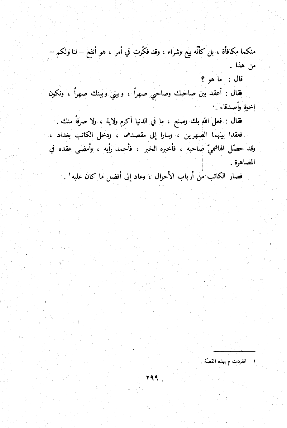 فعقدا بَينهمَا الصهرين، وسارا إِلَى مقصدهما، وَدخل الْكَاتِب بَغْدَاد، وَقد حصل الْهَاشِمِي صَاحبه، فَأخْبرهُ الْخَبَر، فَأَحْمَد رَأْيه، وأمضى عقده فِي الْمُصَاهَرَة.