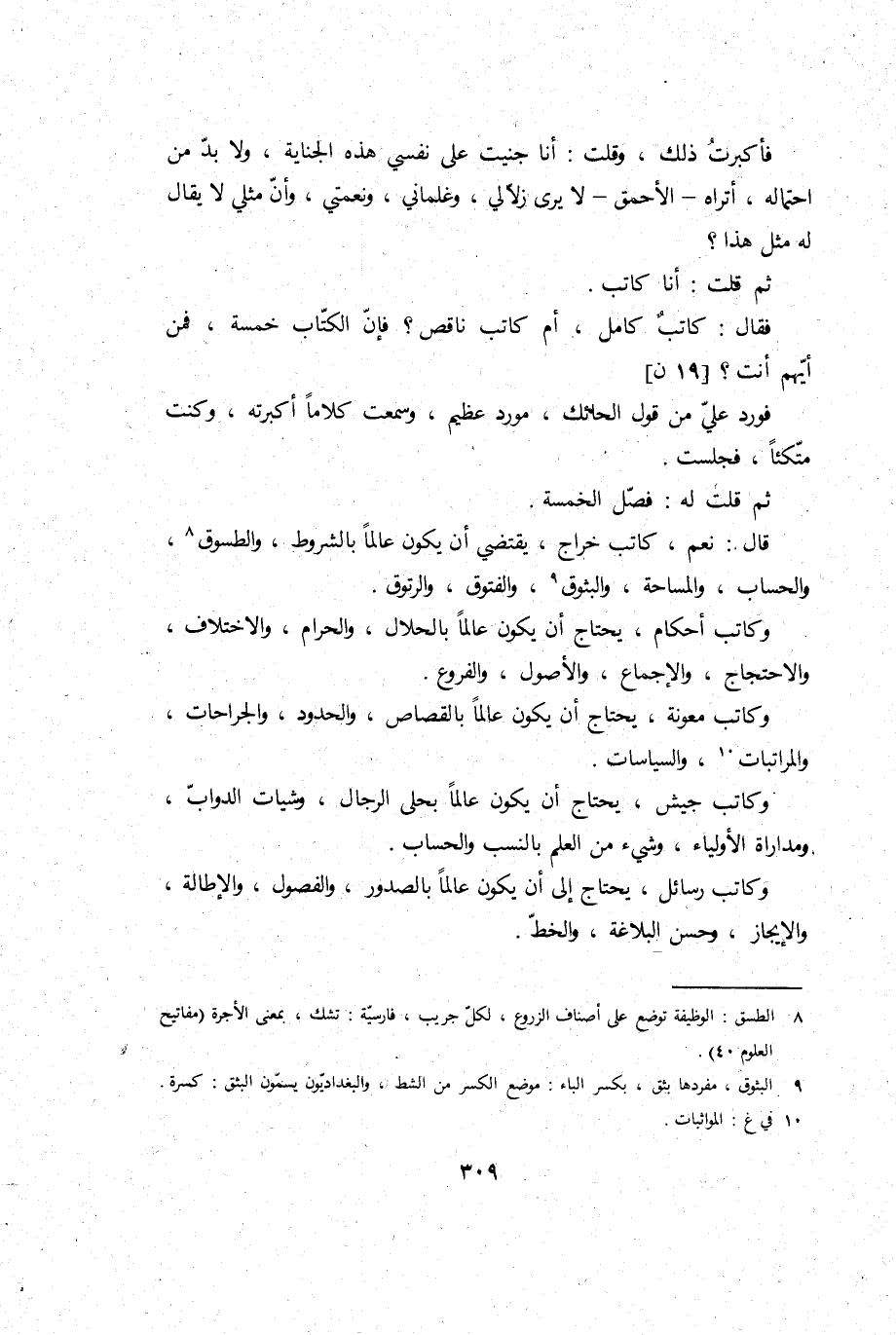 فَقَالَ: كَاتب كَامِل، أم كَاتب نَاقص؟ فَإِن الْكتاب خَمْسَة، فَمن أَيهمْ أَنْت؟ فورد عَليّ من قَول الحائك مورد عَظِيم، وَسمعت كلَاما أكبرته، وَكنت مُتكئا، فَجَلَست.