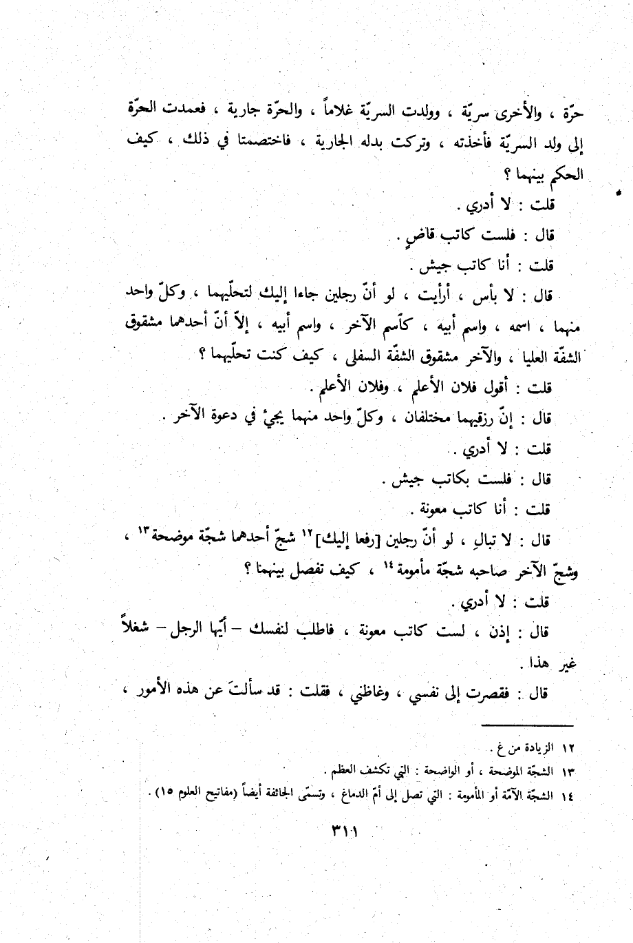 قَالَ: لَا تبال، لَو أَن رجلَيْنِ رفعا إِلَيْك، شج أَحدهمَا شجة مُوضحَة، وشج الآخر صَاحبه شجة مأمومة، كَيفَ تفصل بَينهمَا؟ قلت: لَا أَدْرِي.