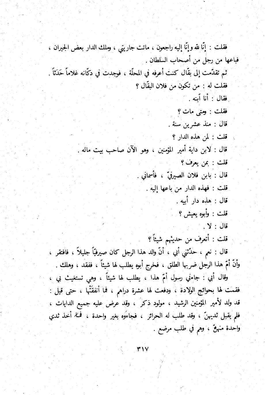 فَقلت: إِنَّا لله وَإِنَّا إِلَيْهِ رَاجِعُون، مَاتَت جاريتي، وَملك الدَّار بعض الْجِيرَان، فَبَاعَهَا من رجل من أَصْحَاب السُّلْطَان.