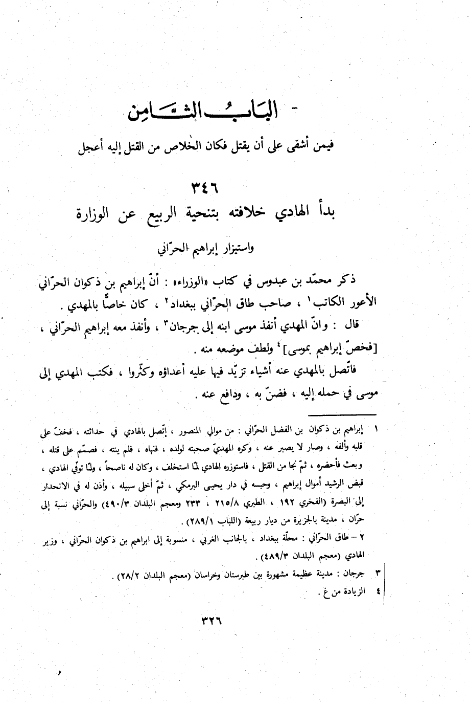قَالَ: وَإِن الْمهْدي أنفذ مُوسَى ابْنه إِلَى جرجان، وأنفذ مَعَه إِبْرَاهِيم الْحَرَّانِي، فَخص إِبْرَاهِيم بمُوسَى، ولطف مَوْضِعه مِنْهُ.