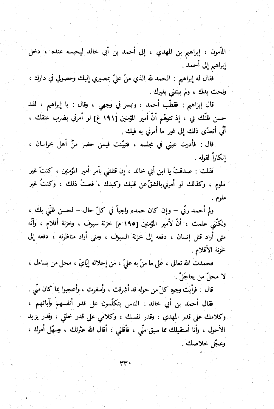 وَلم أَحْمد رَبِّي، وَإِن كَانَ حَمده وَاجِبا فِي كل حَال، لحسن ظَنِّي بك، ولكنني علمت أَن لأمير الْمُؤمنِينَ خَزَنَة سيوف، وخزنة أَقْلَام، وَأَنه مَتى أَرَادَ قتل إِنْسَان؛ دَفعه إِلَى خَزَنَة السيوف، وَمَتى أَرَادَ مناظرته؛ دَفعه إِلَى خَزَنَة الأقلام.