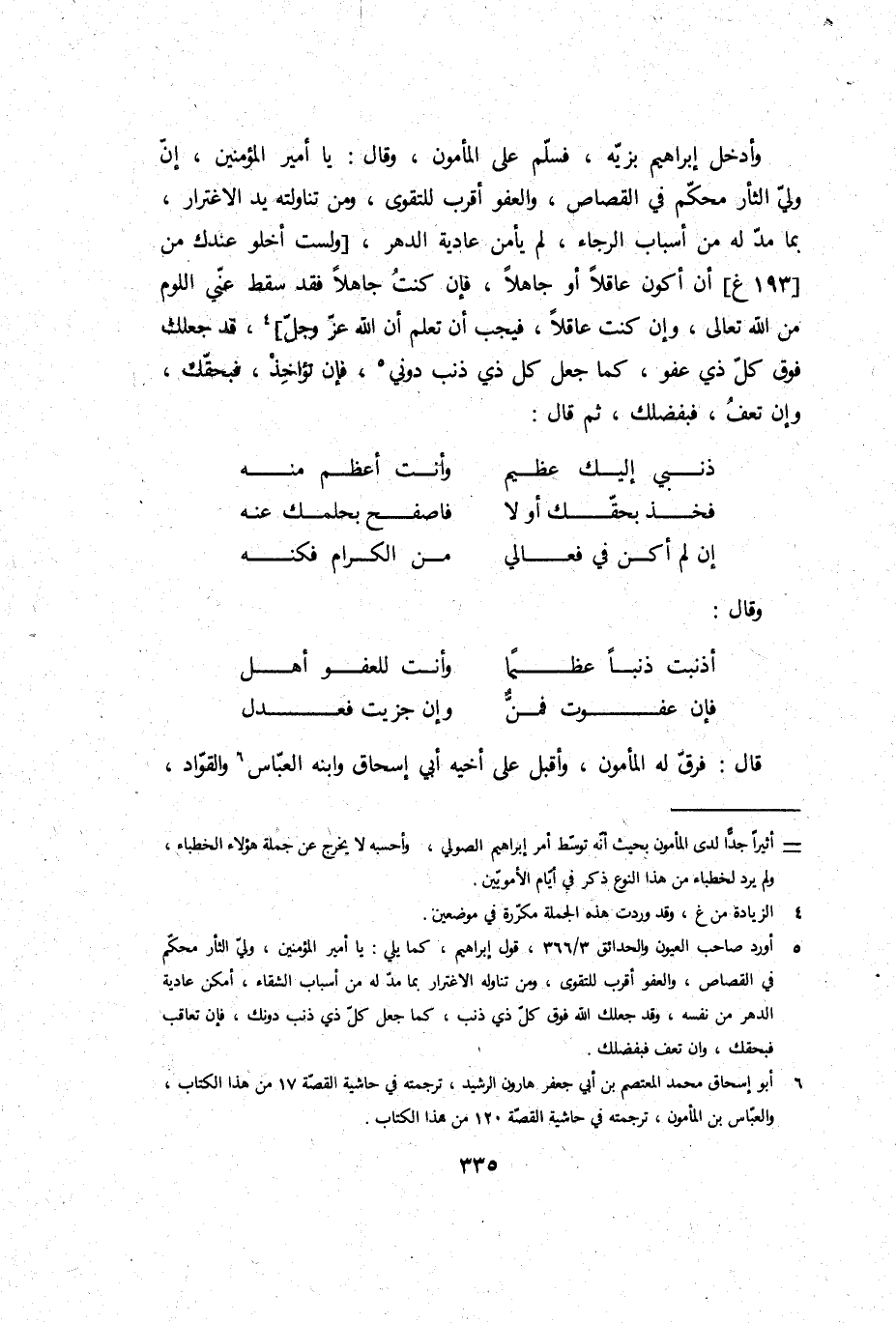 وَأدْخل إِبْرَاهِيم بزيه، فَسلم على الْمَأْمُون، وَقَالَ: يَا أَمِير الْمُؤمنِينَ، إِن ولي الثأر محكّم فِي الْقصاص، وَالْعَفو أقرب للتقوى، وَمن تناولته يَد الاغترار، بِمَا مد لَهُ من أَسبَاب الرَّجَاء، لم يَأْمَن عَادِية الدَّهْر، وَلست أَخْلو عنْدك من أَن أكون عَاقِلا، أَو جَاهِلا، فَإِن كنت جَاهِلا فقد سقط عني اللوم من الله، تَعَالَى، وَإِن كنت عَاقِلا، فَيجب أَن تعلم أَن الله، عز وَجل، قد جعلك فَوق كل ذِي عَفْو، كَمَا جعل كل ذِي ذَنْب دوني، فَإِن تؤاخذ؛ فبحقك، وَإِن تعف؛ فبفضلك، ثمَّ قَالَ: