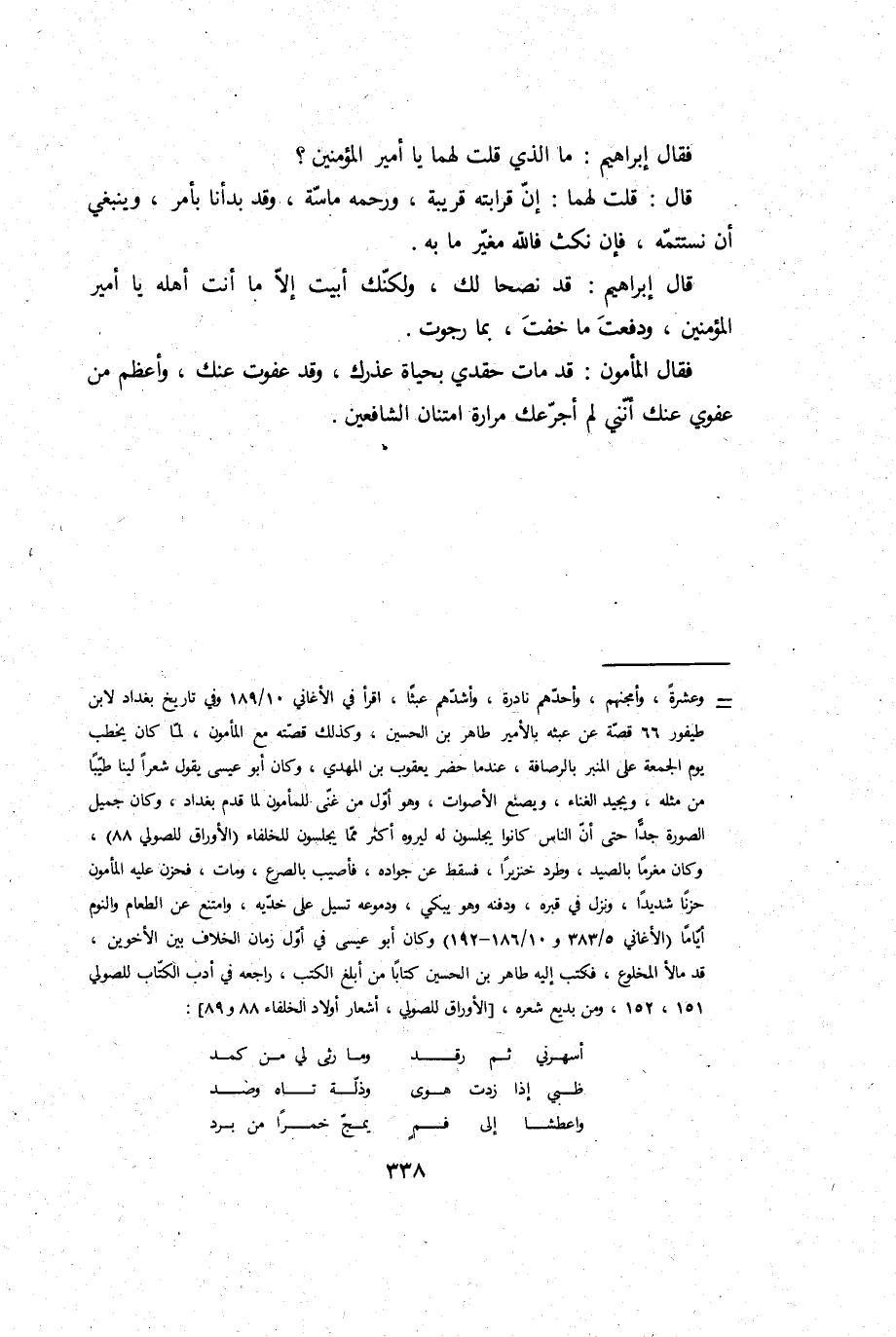 فَقَالَ إِبْرَاهِيم: مَا الَّذِي قلت لَهما، يَا أَمِير الْمُؤمنِينَ؟ قَالَ: قلت لَهما: إِن قرَابَته قريبَة، ورحمه ماسة، وَقد بدأنا بِأَمْر، وَيَنْبَغِي أَن نستتمه، فَإِن نكث فَالله مغير مَا بِهِ.