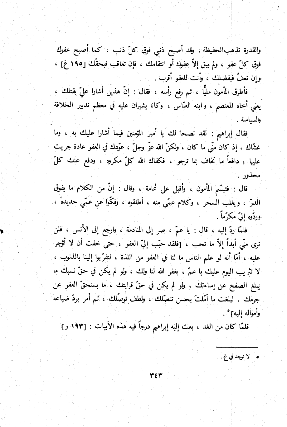 فَقَالَ إِبْرَاهِيم: لقد نصحا لَك، يَا أَمِير الْمُؤمنِينَ، فِيمَا أشارا عَلَيْك بِهِ، وَمَا غشاك، إِذْ كَانَ مني مَا كَانَ، وَلَكِن الله، عز وَجل، عودك فِي الْعَفو عَادَة جريت عَلَيْهَا، دافعا مَا تخَاف بِمَا ترجو، فكفاك الله كل مَكْرُوه، وَدفع عَنْك كل مَحْذُور.