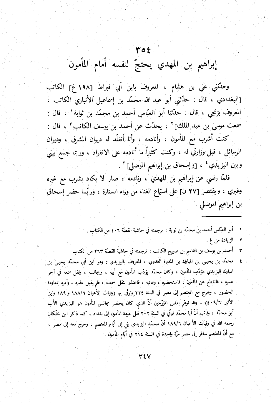 وحَدثني عَليّ بن هِشَام، الْمَعْرُوف بـ: ابْن أبي قِيرَاط الْكَاتِب الْبَغْدَادِيّ، قَالَ: حَدثنِي أَبُو عبد الله مُحَمَّد بن إِسْمَاعِيل الْأَنْبَارِي الْكَاتِب، الْمَعْرُوف بـ: زنجي، قَالَ: حَدثنَا أَبُو الْعَبَّاس أَحْمد بن مُحَمَّد بن ثوابة، قَالَ: سَمِعت مُوسَى بن عبد الْملك، يحدث عَن أَحْمد بن يُوسُف الْكَاتِب، قَالَ: كنت أشْرب مَعَ الْمَأْمُون، وأنادمه، وَأَنا أتقلد لَهُ ديوَان الْمشرق وديوان الرسائل، قبل وزارتي لَهُ، وَكنت كثيرا مَا أنادمه على الِانْفِرَاد، وَرُبمَا جمع بيني وَبَين اليزيدي، وَإِسْحَاق بن إِبْرَاهِيم الْموصِلِي.
