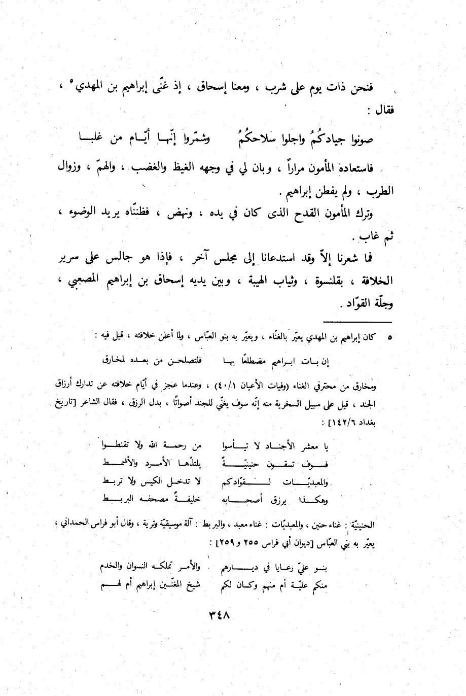 فَنحْن ذَات يَوْم على شرب، ومعنا إِسْحَاق، إِذْ غنى إِبْرَاهِيم بن الْمهْدي، فَقَالَ: