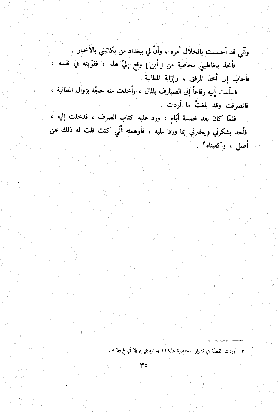 فَلَمَّا كَانَ بعد خَمْسَة أَيَّام؛ ورد عَلَيْهِ كتاب الصّرْف، فَدخلت إِلَيْهِ، فَأخذ يشكرني ويخبرني بِمَا ورد عَلَيْهِ، فأوهمته أَنِّي كنت قلت لَهُ ذَلِك عَن أصل، وكفيناه.