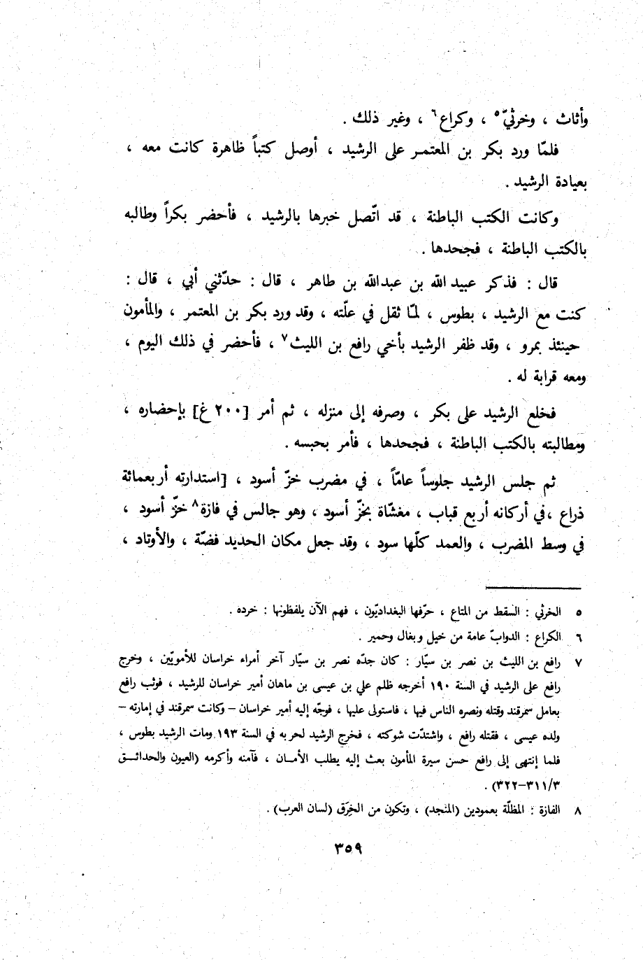 وَكَانَت الْكتب الْبَاطِنَة، قد اتَّصل خَبَرهَا بالرشيد، فأحضر بكرا، وطالبه بالكتب الْبَاطِنَة، فجحدها.