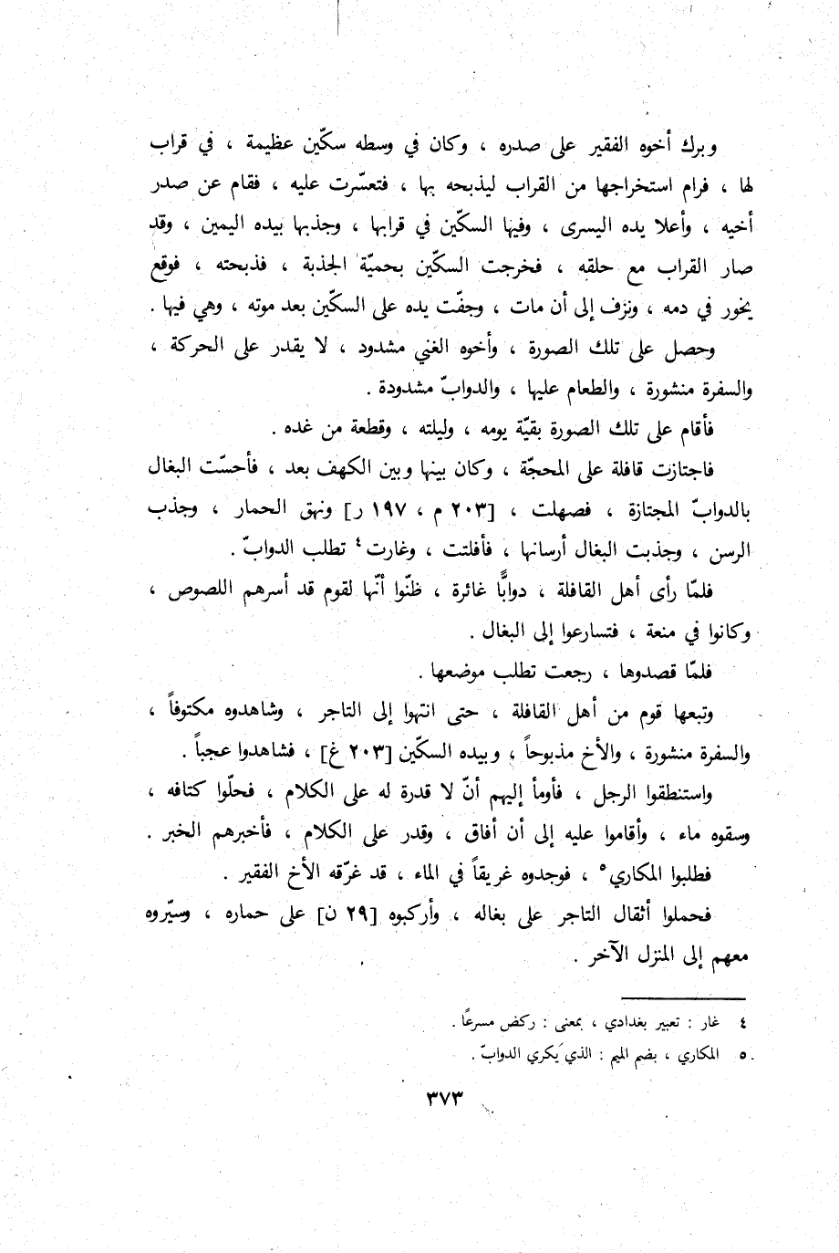 وتبعها قوم من أهل الْقَافِلَة، حَتَّى انْتَهوا إِلَى التَّاجِر، وشاهدوه مكتوفا، والسفرة منشورة، وَالْأَخ مذبوحا، وَبِيَدِهِ السكين، فشاهدوا عجبا.