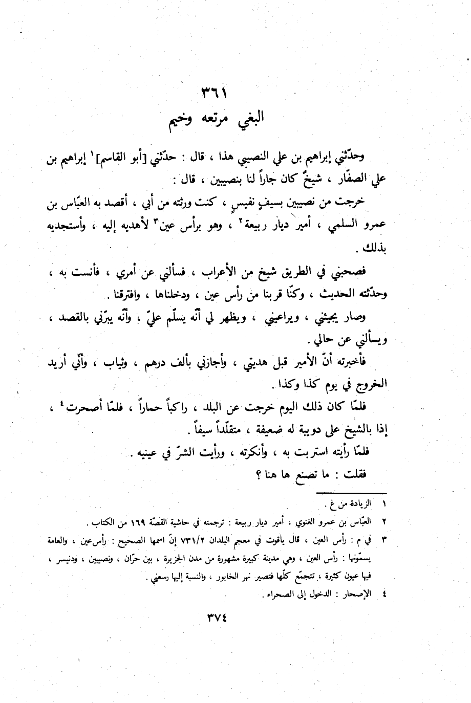 وحَدثني إِبْرَاهِيم بن عَليّ النصيبي، هَذَا، قَالَ: حَدثنِي أَبُو الْقَاسِم إِبْرَاهِيم بن عَليّ الصفار، شيخ كَانَ جارا لنا بنصيبين، قَالَ: خرجت من نَصِيبين بِسيف نَفِيس، كنت ورثته من أبي، أقصد بِهِ الْعَبَّاس بن عَمْرو السّلمِيّ، أَمِير ديار ربيعَة، وَهُوَ بِرَأْس عين، لأهديه إِلَيْهِ، وأستجديه بذلك.