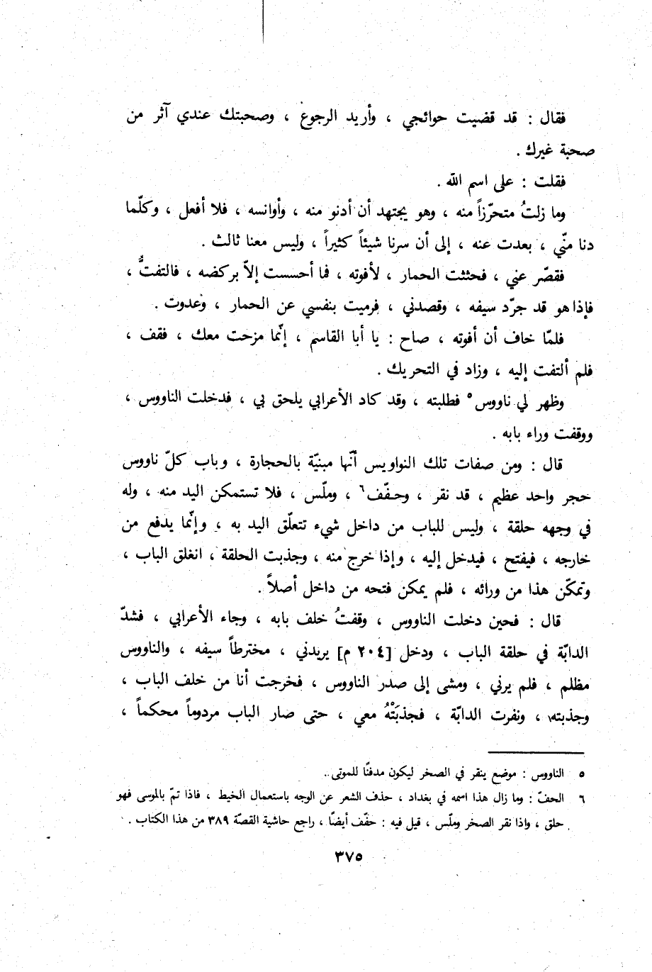 قَالَ: فحين دخلت الناووس؛ وقفت خلف بَابه، وَجَاء الْأَعرَابِي، فَشد الدَّابَّة فِي حَلقَة الْبَاب، وَدخل يُرِيدنِي، مخترطا سَيْفه، والناووس مظلم، فَلم يرني، وَمَشى إِلَى صدر الناووس، فَخرجت أَنا من خلف الْبَاب، وجذبته، ونفرت الدَّابَّة، فجذبته معي، حَتَّى صَار الْبَاب مردوما ومحكما