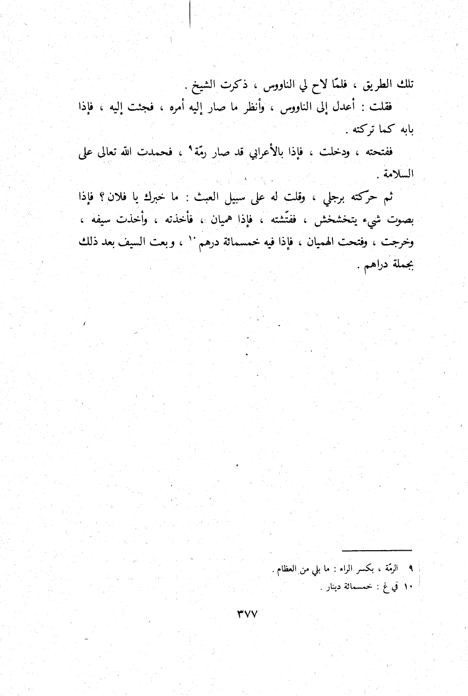 ثمَّ حركته برجلي، وَقلت لَهُ على سَبِيل الْعَبَث: مَا خبرك، يَا فلَان؟ فَإِذا بِصَوْت شَيْء يتخشخش، ففتشته، فَإِذا هميان، فَأَخَذته، وَأخذت سَيْفه، وَخرجت، وَفتحت الْهِمْيَان، فَإِذا فِيهِ خمس مائَة دِرْهَم، وبعت السَّيْف بعد ذَلِك بجملة دَرَاهِم.