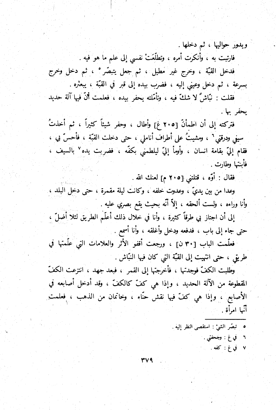 فعلّمت الْبَاب، وَرجعت أقفو الْأَثر والعلامات الَّتِي علمتها فِي طريقي، حَتَّى انْتَهَيْت إِلَى الْقبَّة الَّتِي كَانَ فِيهَا النباش.