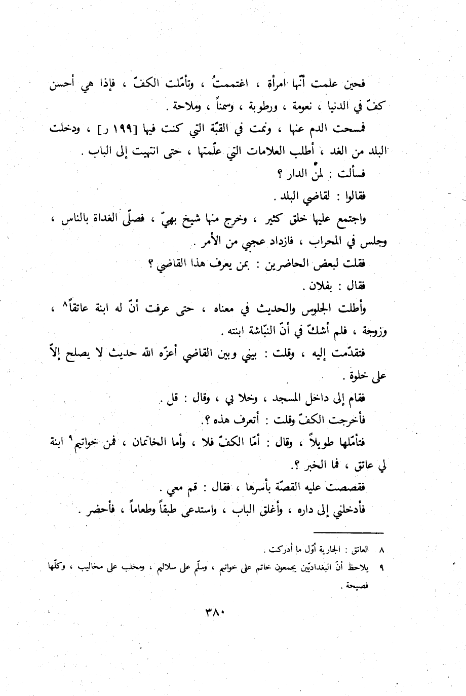 فحين علمت أَنَّهَا امْرَأَة؛ اغتممت، وتأملت الْكَفّ، فَإِذا هِيَ أحسن كف فِي الدُّنْيَا؛ نعومة، ورطوبة، وَسمنًا، وملاحة.
