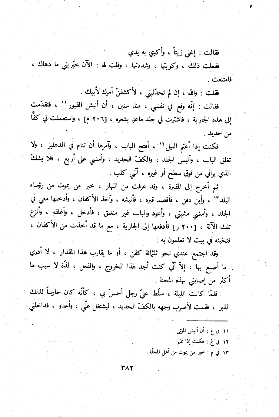 ثمَّ أخرج إِلَى الْمقْبرَة، وَقد عرفت من النَّهَار، خبر من يَمُوت من رُؤَسَاء الْبَلَد، وَأَيْنَ دفن، فأقصد قَبره، فأنبشه، وآخذ الأكفان، وأدخلها معي فِي الْجلد، وأمشي مشيتي، وأعود وَالْبَاب غير منغلق، فَأدْخل، وأغلقه، وأنزع تِلْكَ الْآلَة، فأدفعها إِلَى الْجَارِيَة، مَعَ مَا قد أخذت من الأكفان، فتخبئه فِي بَيت لَا تعلمُونَ بِهِ.