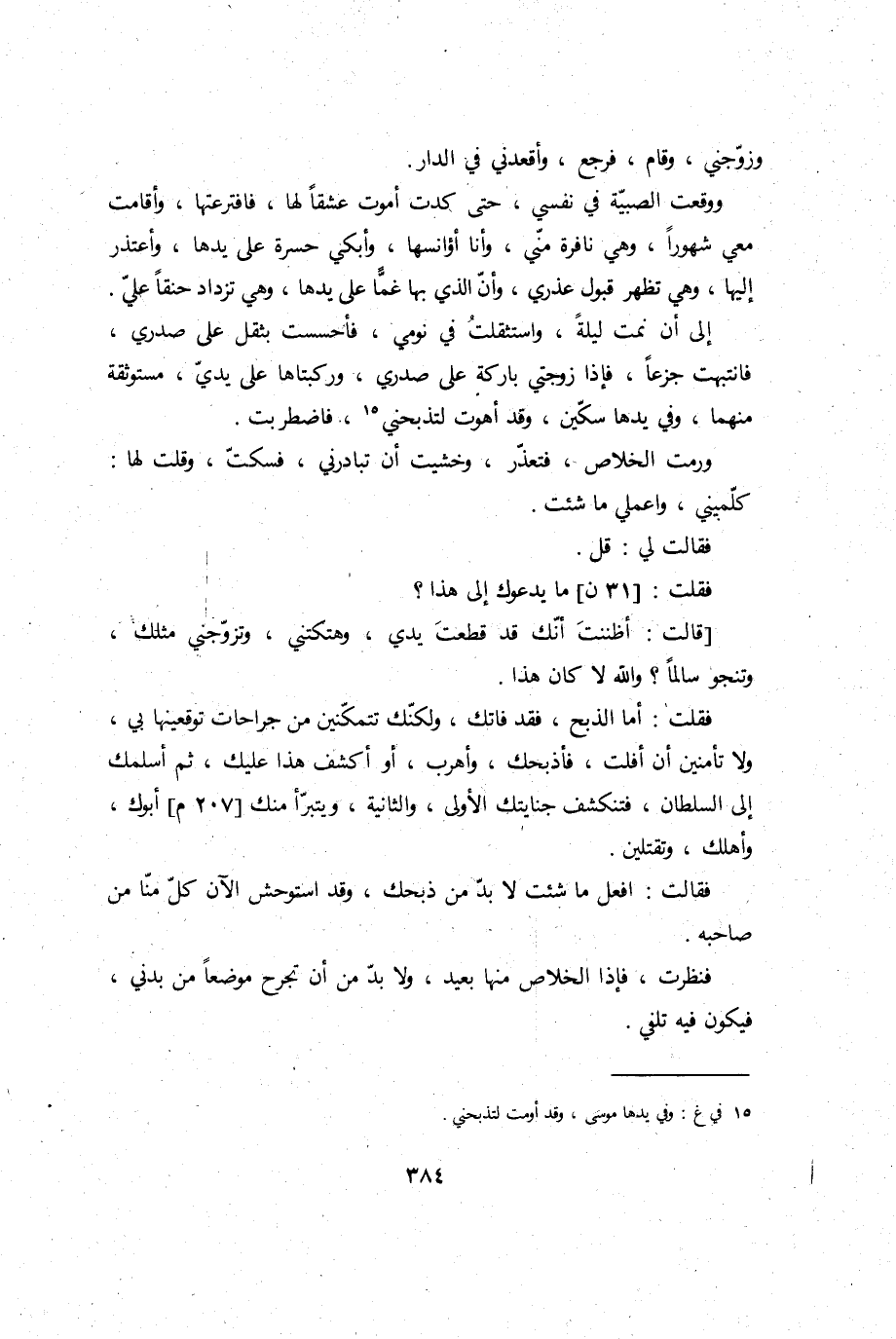 فَقلت: أما الذّبْح، فقد فاتك؛ وَلَكِنَّك تتمكنين من جراحات توقعينها بِي، وَلَا تأمنين أَن أفلت، فأذبحك، وأهرب، أَو أكشف هَذَا عَلَيْك، ثمَّ أسلمك إِلَى السُّلْطَان، فتنكشف جنايتك الأولى وَالثَّانيَِة، ويتبرأ مِنْك أَبوك وَأهْلك، وتقتلين.