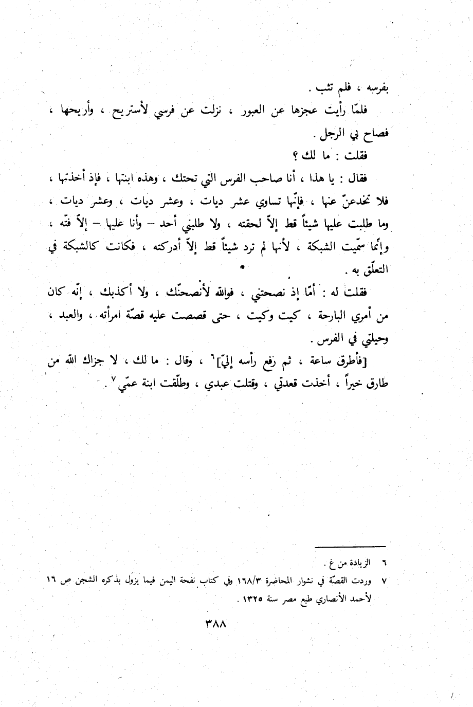 فَقلت: مَا لَك؟ فَقَالَ: يَا هَذَا، أَنا صَاحب الْفرس الَّتِي تَحْتك، وَهَذِه ابْنَتهَا، فَإِذا أَخَذتهَا، فَلَا تخدعن عَنْهَا، فَإِنَّهَا تَسَاوِي عشر ديات، وَعشر ديات، وَعشر ديات، وَمَا طلبت عَلَيْهَا شَيْئا قطّ إِلَّا لحقته، وَلَا طلبني أحد، وَأَنا عَلَيْهَا، إِلَّا فته، وَإِنَّمَا سميت الشبكة؛ لِأَنَّهَا لم ترد شَيْئا قطّ إِلَّا أَدْرَكته فَكَانَت كالشبكة فِي التَّعَلُّق بِهِ.