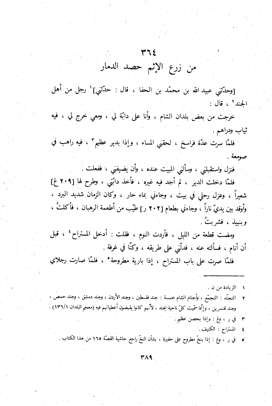 وحَدثني عبيد الله بن مُحَمَّد بن الحفا، قَالَ: حَدثنِي رجل من أهل الْجند، قَالَ: خرجت من بعض بلدان الشَّام، وَأَنا على دَابَّة لي، وَمَعِي خرج لي، فِيهِ ثِيَاب ودراهم.