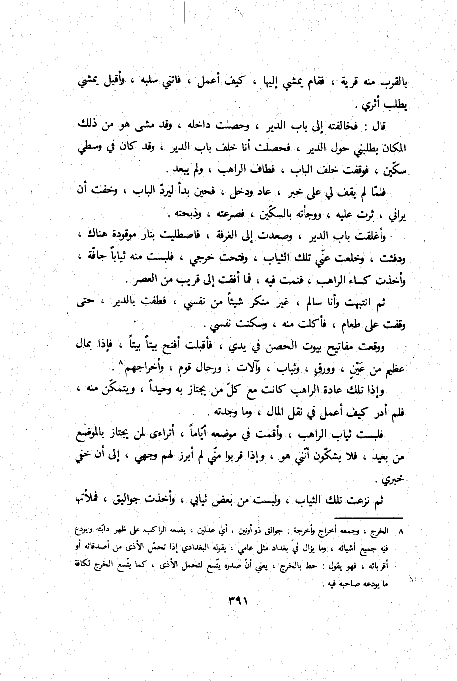 وَإِذا تِلْكَ عَادَة الراهب كَانَت مَعَ كل من يجتاز بِهِ وحيدا، ويتمكن مِنْهُ، فَلم أدر كَيفَ أعمل فِي نقل المَال، وَمَا وجدته.