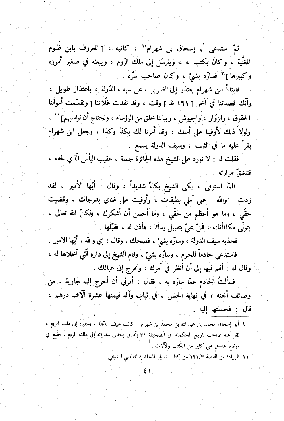 فابتدأ ابْن شهرام يعْتَذر إِلَى الضَّرِير، عَن سيف الدولة، باعتذار طَوِيل، وَأَنَّك قصدتنا فِي آخر وَقت، وَقد نفدت غلاتنا، وتقسمت أَمْوَالنَا الْحُقُوق وَالزُّوَّارِ والجيوش، وببابنا خلق من الرؤساء، ونحتاج أَن نواسيهم، وَلَوْلَا ذَلِك لأوفينا على أملك، وَقد أمرنَا لَك بِكَذَا وَكَذَا، وَجعل ابْن شهرام يقْرَأ عَلَيْهِ مَا فِي الثبت، وَسيف الدولة يسمع.