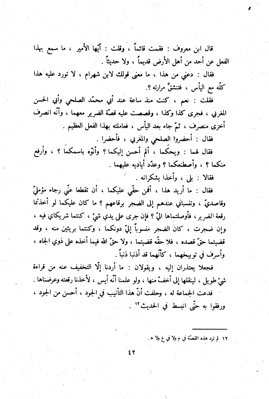 فَقَالَ: دَعْنِي من هَذَا، مَا معنى قَوْلك لِابْنِ شهرام: لَا تورد عَلَيْهِ هَذَا كُله مَعَ الْيَأْس، فَتَنْشَق مرارته؟ فَقلت: نعم، كنت مُنْذُ سَاعَة عِنْد أبي مُحَمَّد الصلحي وَأبي الْحسن المغربي، فَجرى كَذَا وَكَذَا، وقصصت عَلَيْهِ قصَّة الضَّرِير مَعَهُمَا، وَأَنه انْصَرف أخزى منصرف، ثمَّ جَاءَ بعد الْيَأْس، فعاملته بِهَذَا الْفِعْل الْعَظِيم.