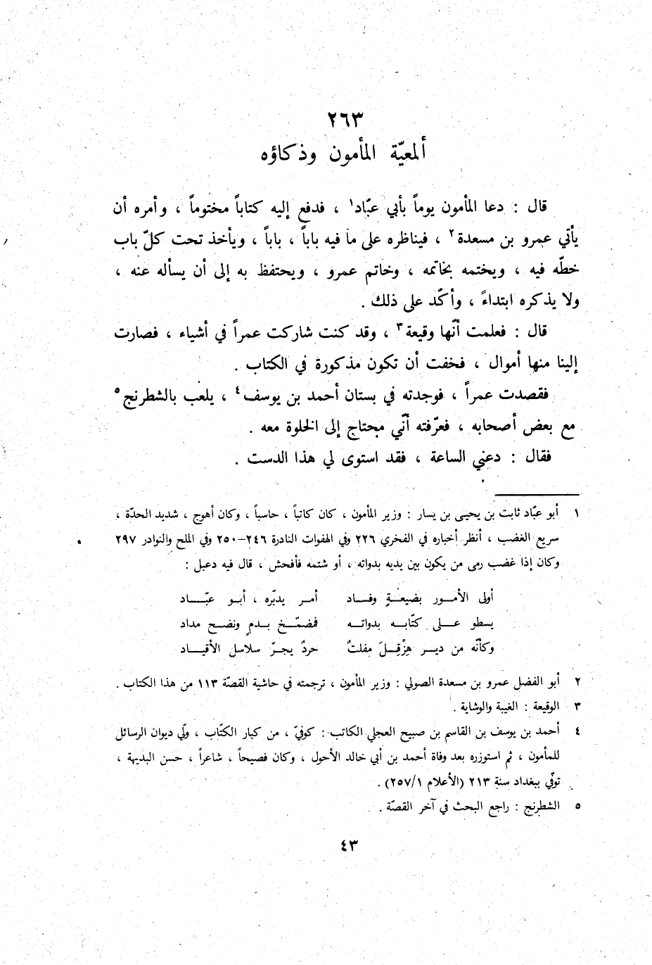 فقصدت عمرا، فَوَجَدته فِي بُسْتَان أَحْمد بن يُوسُف، يلْعَب بالشطرنج مَعَ بعض أَصْحَابه، فعرفته أَنِّي مُحْتَاج إِلَى الْخلْوَة مَعَه.