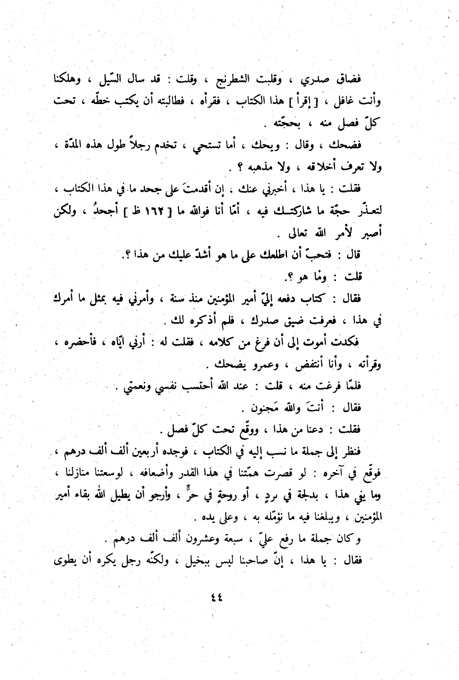 فَضَحِك، وَقَالَ: وَيحك، أما تَسْتَحي، تخْدم رجلا طول هَذِه الْمدَّة، وَلَا تعرف أخلاقه، وَلَا مذْهبه؟ فَقلت: يَا هَذَا، أَخْبرنِي عَنْك، إِن أقدمت على جحد مَا فِي هَذَا الْكتاب، لتعذر حجَّة؛ مَا شاركتك فِيهِ، أما أَنا فوَاللَّه مَا أجحد، وَلَكِن أَصْبِر لأمر الله، تَعَالَى.