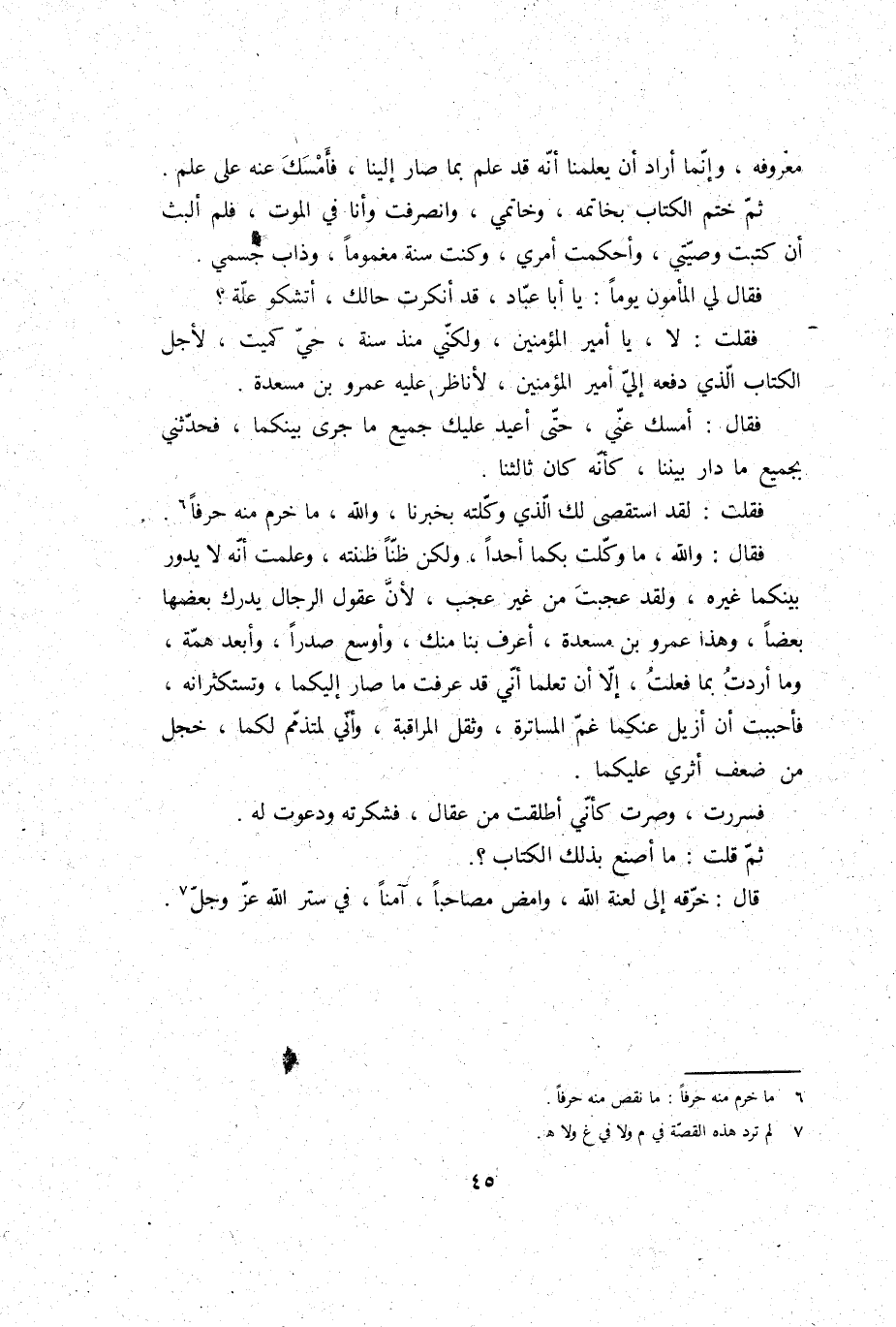 فَقَالَ: وَالله، مَا وكلت بكما أحدا، وَلَكِن ظنا ظننته، وَعلمت أَنه لَا يَدُور بَيْنكُمَا غَيره، وَلَقَد عجبت من غير عجب؛ لِأَن عقول الرِّجَال يدْرك بَعْضهَا بَعْضًا، وَهَذَا عَمْرو بن مسْعدَة، أعرف بِنَا مِنْك، وأوسع صَدرا، وَأبْعد همة، وَمَا أردْت بِمَا فعلت، إِلَّا أَن تعلما أَنِّي قد عرفت مَا صَار إلَيْكُمَا، وتستكثرانه، فَأَحْبَبْت أَن أزيل عنكما غم المساترة، وَثقل المراقبة، وَأَنِّي لمتذمم لَكمَا، خجل من ضعف أثري عَلَيْكُمَا.