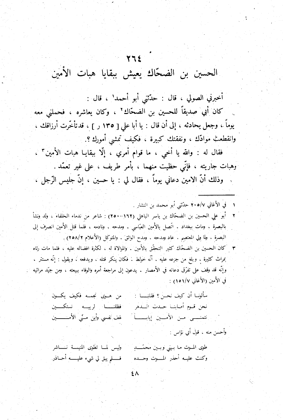 أَخْبرنِي الصولي، قَالَ: حَدثنِي أَبُو أَحْمد، قَالَ: كَانَ أبي صديقا للحسين بن الضَّحَّاك، وَكَانَ يعاشره، فَحَمَلَنِي مَعَه يَوْمًا، وَجعل يحادثه، إِلَى أَن قَالَ: يَا أَبَا عَليّ، قد تَأَخَّرت أرزاقك، وانقطعت موادك، ونفقتك كَبِيرَة، فَكيف تمشي أمورك؟ فَقَالَ لَهُ: وَالله يَا أخي، مَا قوام أَمْرِي، إِلَّا ببقايا هبات الْأمين، وهبات جَارِيَته، فَإِنِّي حظيت مِنْهُمَا، بِأَمْر طريف، على غير تعمد.