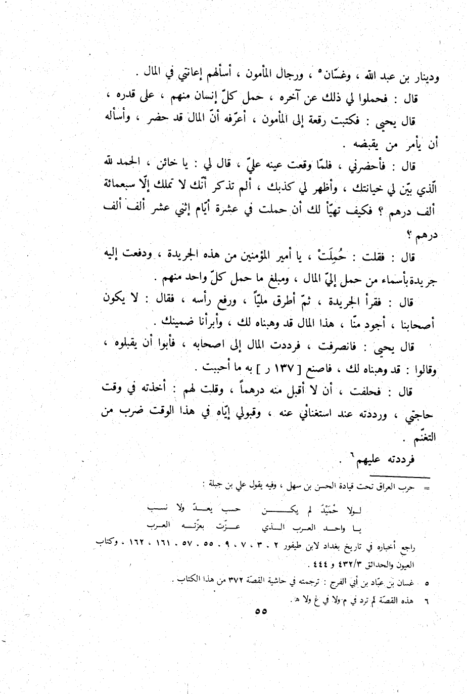 قَالَ: فأحضرني، فَلَمَّا وَقعت عينه عَليّ؛ قَالَ لي: يَا خائن، الْحَمد لله الَّذِي بَين لي خِيَانَتك، وَأظْهر لي كَذبك، ألم تذكر أَنَّك لَا تملك إِلَّا سبع مائَة ألف دِرْهَم؟ فَكيف تهَيَّأ لَك أَن حملت فِي عشرَة أَيَّام اثْنَي عشر ألف ألف دِرْهَم؟ قَالَ: فَقلت: حُمِلَتْ، يَا أَمِير الْمُؤمنِينَ، من هَذِه الجريدة، وَدفعت إِلَيْهِ جَرِيدَة بأسماء من حمل إِلَيّ المَال، ومبلغ مَا حمل كل وَاحِد مِنْهُم.