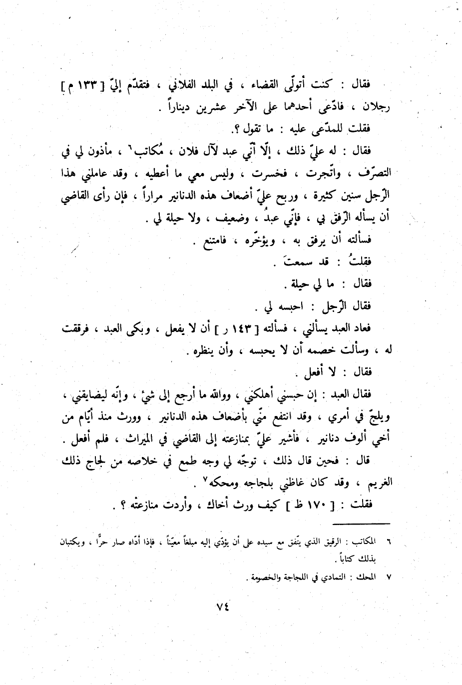 فَقلت للْمُدَّعى عَلَيْهِ: مَا تَقول؟ فَقَالَ: لَهُ عَليّ ذَلِك، إِلَّا أَنِّي عبد لآل فلَان، مكَاتب، مَأْذُون لي فِي التَّصَرُّف، واتجرت، فخسرت، وَلَيْسَ معي مَا أعْطِيه، وَقد عاملني هَذَا الرجل سِنِين كَثِيرَة، وَربح عَليّ أَضْعَاف هَذِه الدَّنَانِير مرَارًا، فَإِن رأى القَاضِي أَن يسْأَله الرِّفْق بِي، فَإِنِّي عبد، وَضَعِيف، وَلَا حِيلَة لي.