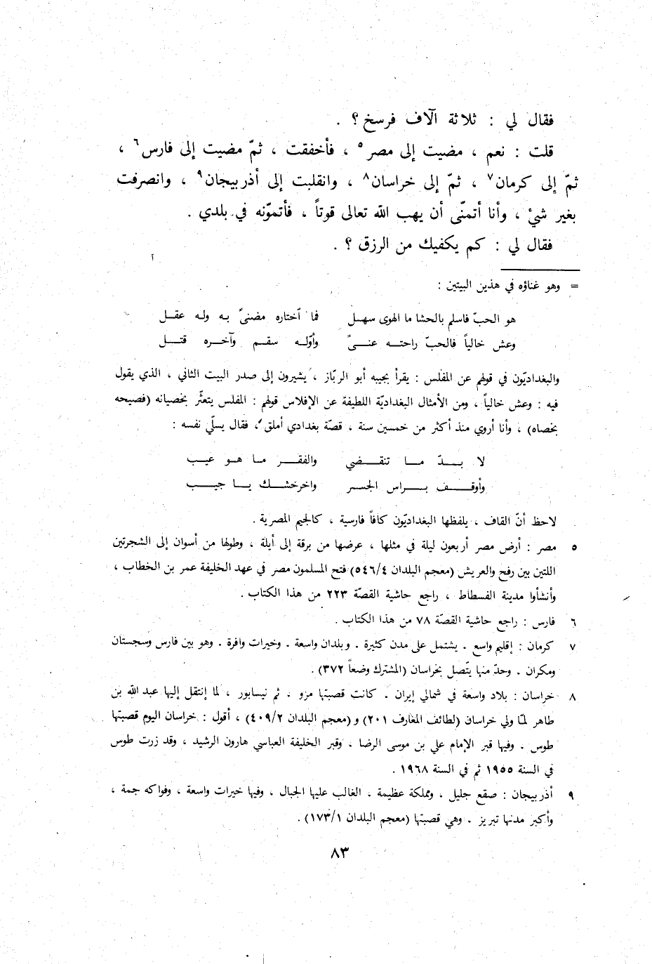 فَقَالَ لي: ثَلَاثَة آلَاف فَرسَخ؟ قلت: نعم، مضيت إِلَى مصر، فأخفقت، ثمَّ مضيت إِلَى فَارس، ثمَّ إِلَى كرمان، ثمَّ إِلَى خُرَاسَان، وانقلبت إِلَى أذربيجان، وانصرفت بِغَيْر شَيْء، وَأَنا أَتَمَنَّى أَن يهب الله، تَعَالَى، قوتا، فأتمونه فِي بلدي.
