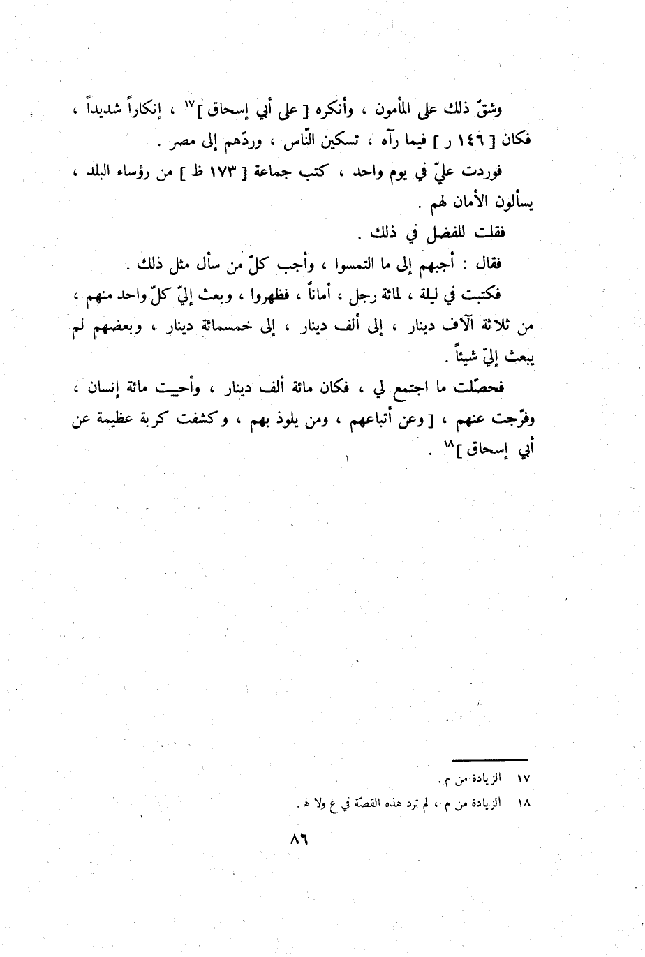 فَكتبت فِي لَيْلَة، لمِائَة رجل، أَمَانًا، فظهروا، وَبعث إِلَيّ كل وَاحِد مِنْهُم، من ثَلَاثَة آلَاف دِينَار، إِلَى ألف دِينَار، إِلَى خمس مائَة دِينَار، وَبَعْضهمْ لم يبْعَث إِلَيّ شَيْئا.