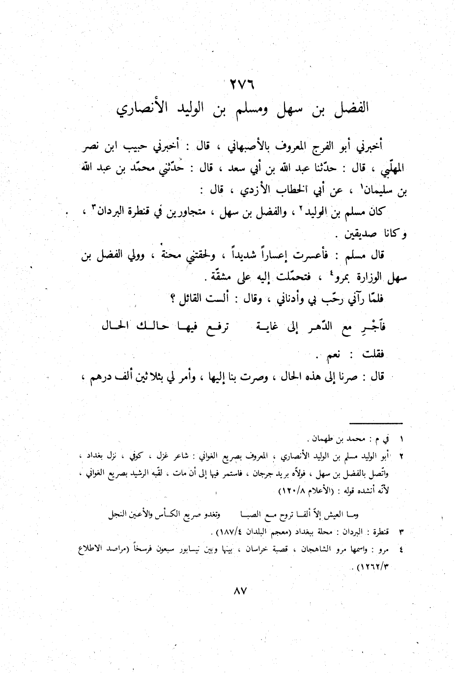 أَخْبرنِي أَبُو الْفرج، الْمَعْرُوف بـ: الْأَصْبَهَانِيّ، قَالَ: أَخْبرنِي حبيب بن نصر المهلبي، قَالَ: حَدثنَا عبد الله بن أبي سعد، قَالَ: حَدثنِي مُحَمَّد عبد الله بن سُلَيْمَان، عَن أبي الْخطاب الْأَزْدِيّ، قَالَ: كَانَ مُسلم بن الْوَلِيد، وَالْفضل بن سهل، متجاورين فِي قنطرة البردان، وَكَانَا صديقين.